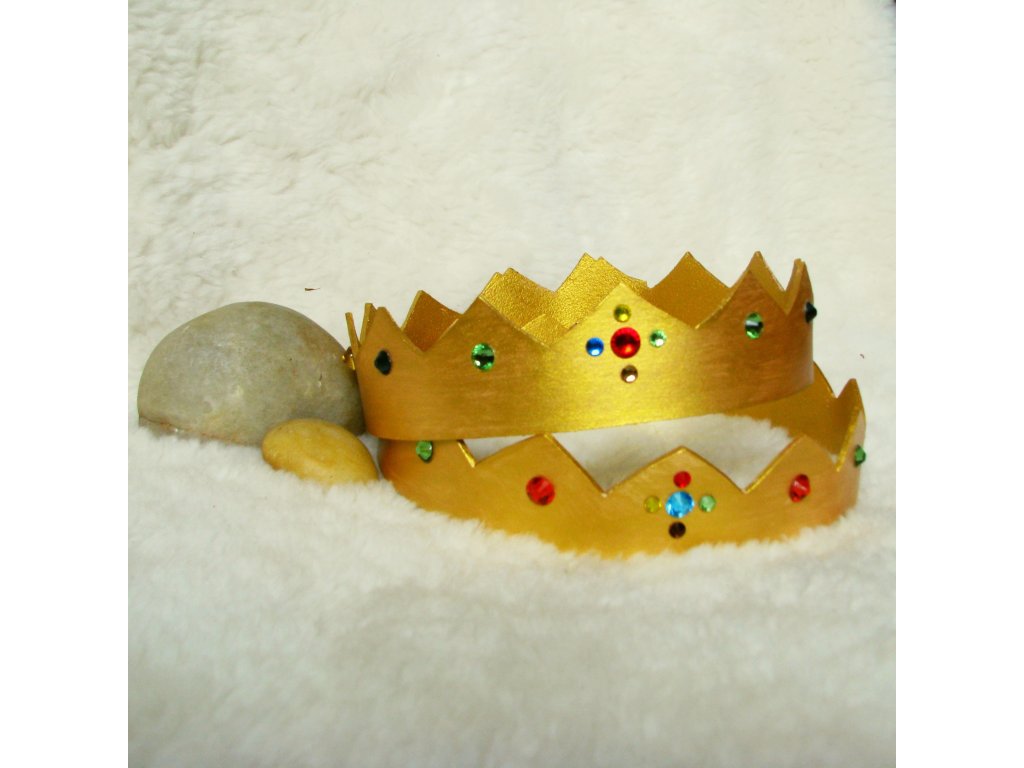 Nastavitelná a trvanlivá koruna, která poroste s Vašimi dětmi. Základ koruny tvoří 2-2,5mm silná třílem činěná useň barvená zdravotně nezávdnou barvou. Ozdobena je skleněnými drahokamy přilepeným metodou hot fix. Velikost koruny lze snadno nastavit pro hlavičky malých i velkých(dospělých) králů a královen. Zapínání je na sedlářský knoflík ....zápínání i nastevení velikosti je jednoduché a dobře drží, jen je potřeba knoflíčk čas od času dotáhnout.